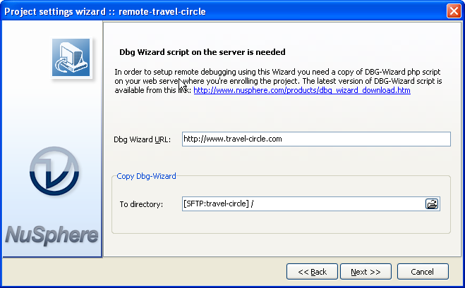 One of the next pages of the Wizard will prompt you to install dbg-wizard.php script to your remote site to help setting up the debugger.