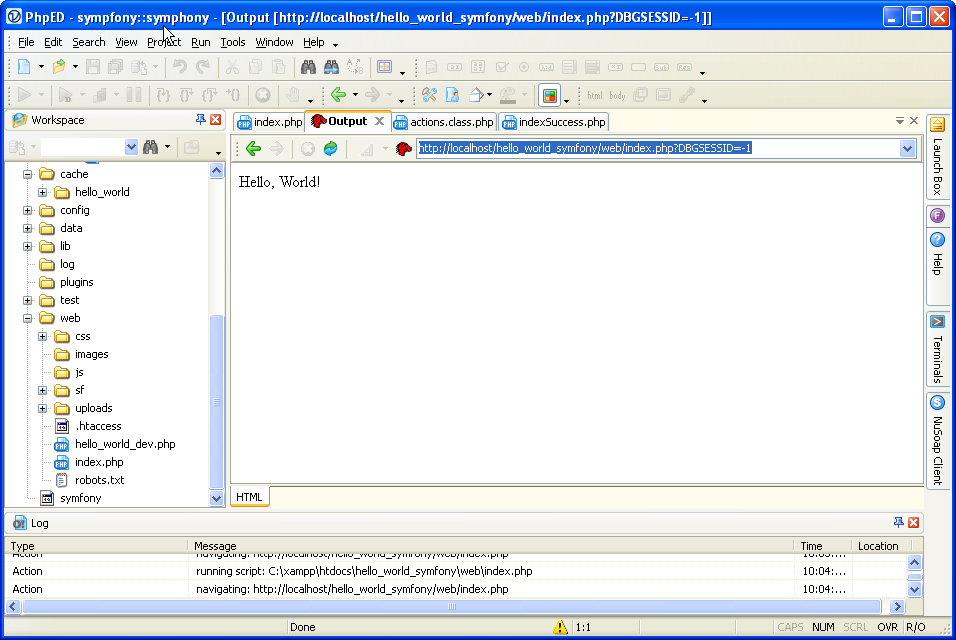 - You can now type http://localhost/hello_world/web in your browser window and press enter - or, w/o ever leaving the editor, open file symfony/web/index.php and hit Run button to see the output in PhpED's embedded FireFox (or any other browser you have configured in Tools->Settings):