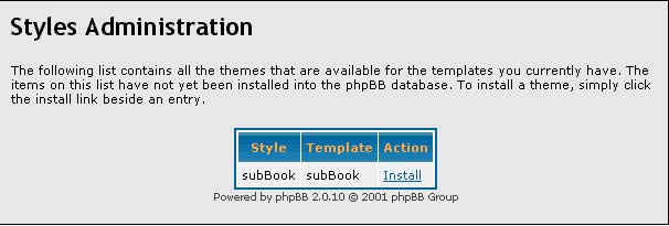 the style's installation. To install a theme, just click the Install link next to the entry in the list. phpBB will now show the style in the drop-down
