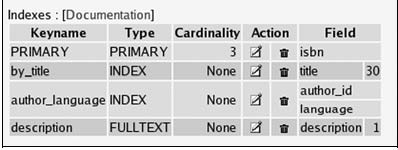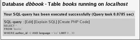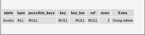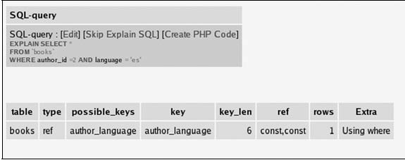We can see that the EXPLAIN command has been passed to MySQL, telling us that the possible_keys used is author_language. Thus, we know that this index will be used for this type of query. If this index did not exist, the result would have been quite different: