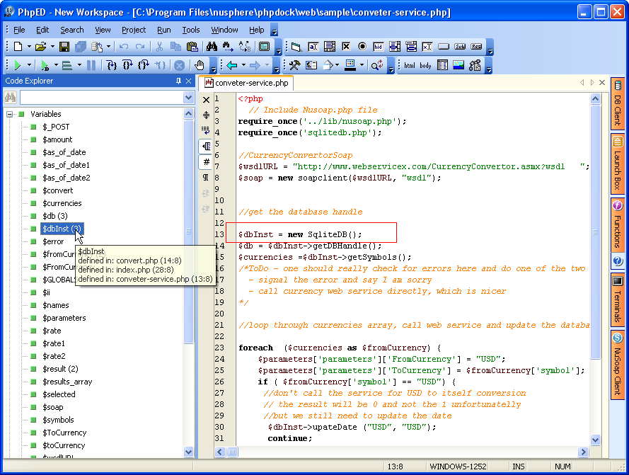 - If the selected element is a PHP variable, the cursor display will provide insight into where the variable is used and/or defined. If the design of a PHP application involves the same variable used in more than one PHP File or in multiple locations in the same PHP File, the PHP Designer can navigate between different instances of the same PHP variables by repeatedly clicking on that variable. For example, the illustration below shows the occurrences of PHP Variable $dbInst. This particular design has three files, of which one is shown in the following illustration: