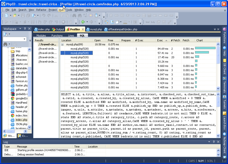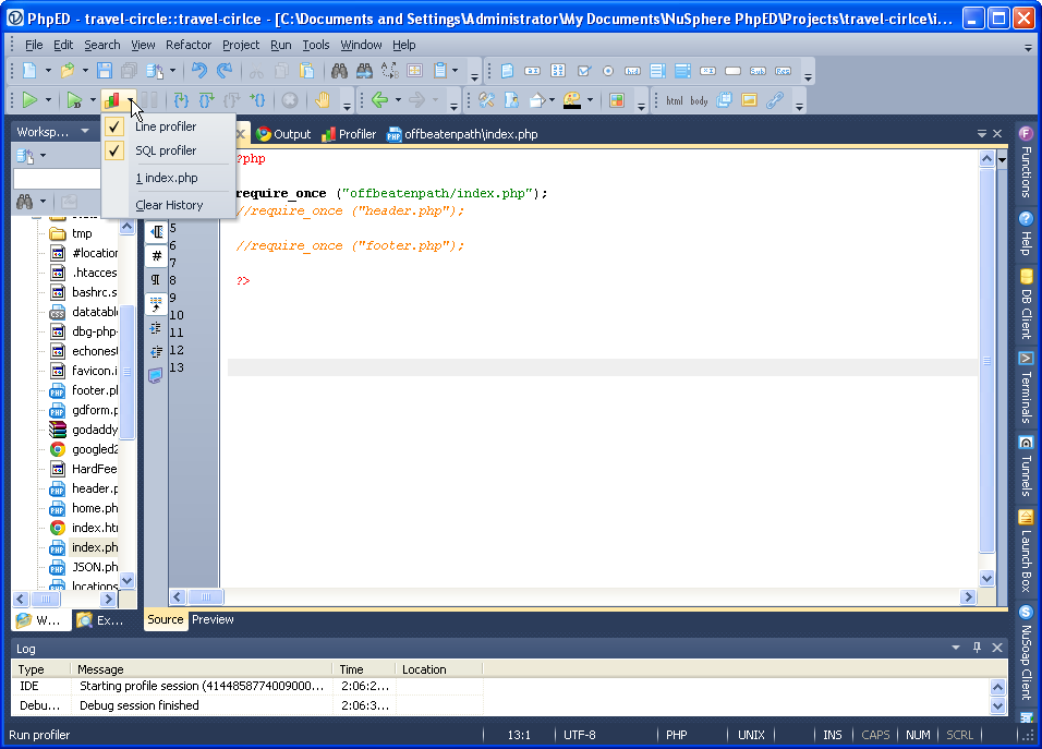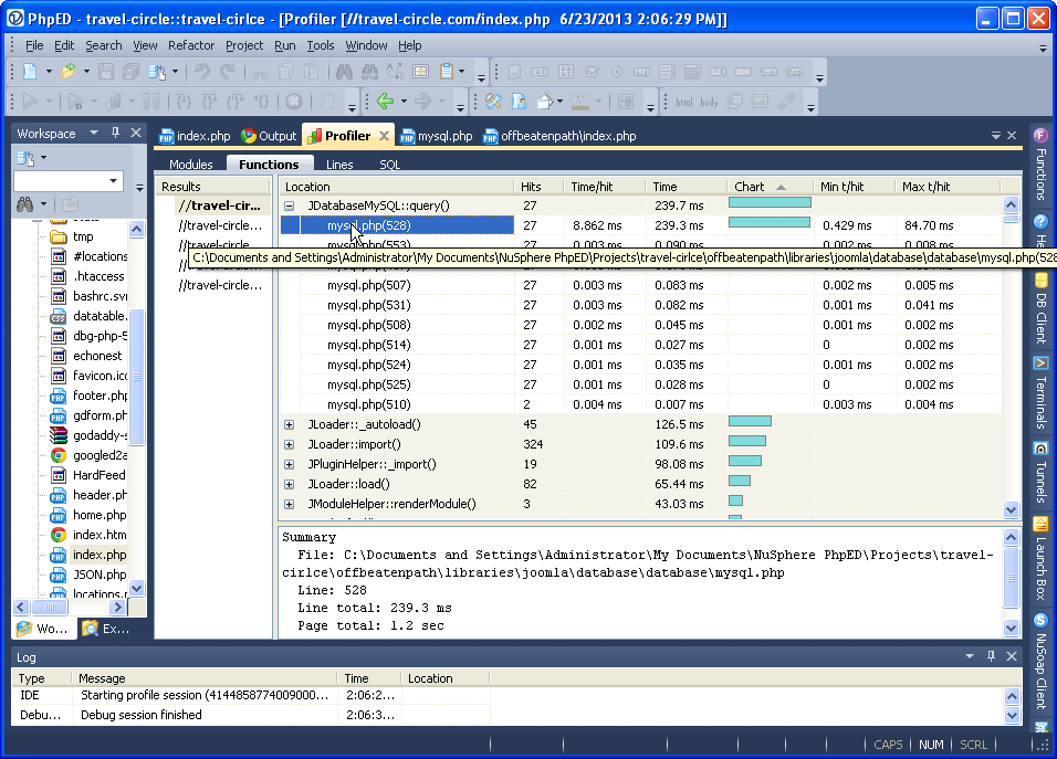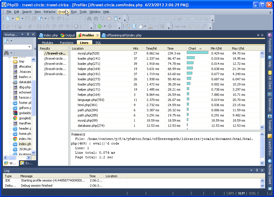 PhpED has always had a php profiler - the feature that allows you to find the bottlenecks in your php application and even shows the chart graph of performance profiles of your code - sorted by modules, functions or lines. To use it you need to setup PhpED php debugger, which is pretty easy and works for both local and remote projects, including even shared hosting like GoDaddy's offerings. We quickly setup the debugger in the IDE following the steps outlined in our article Debugging applications with PHP Editor/IDE in shared hosting (GoDaddy) using the same account of one of our staff editors on travel-circel.com.